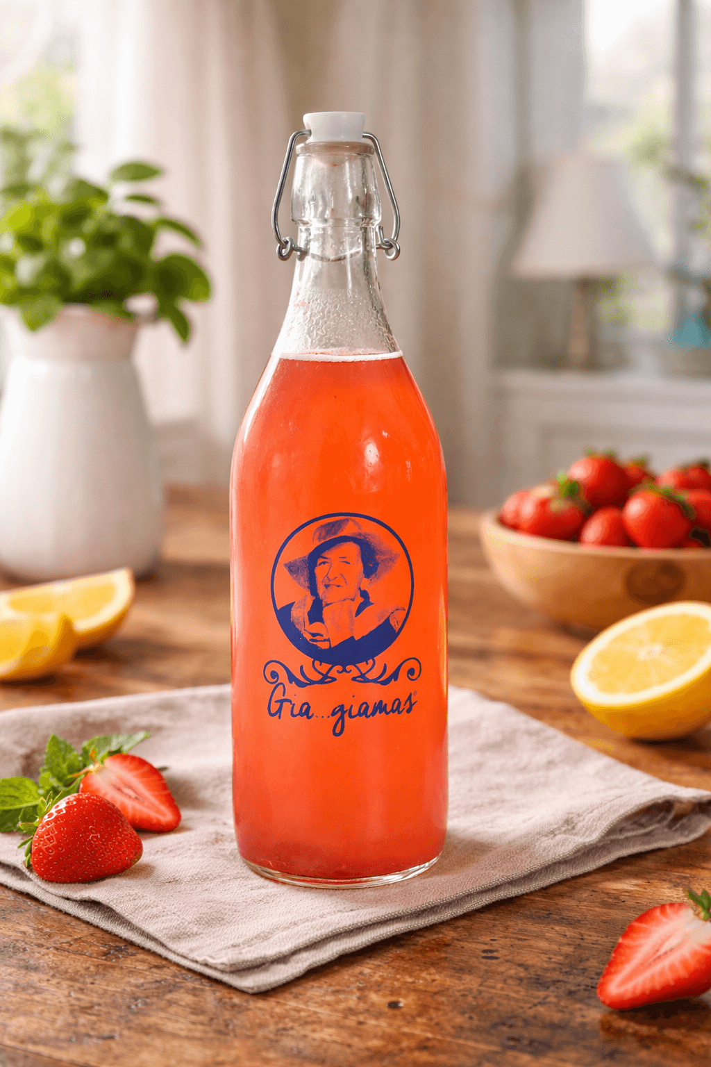 Deze glazen beugelfles van Gia giamas is een echte eyecatcher. Gemaakt van stevig glas en voorzien van een bijzonder detail: het logo wordt zichtbaar blauw als de sap koud genoeg is!